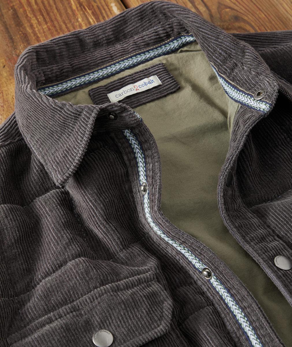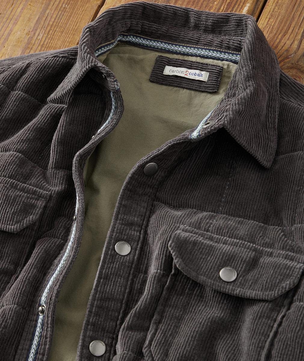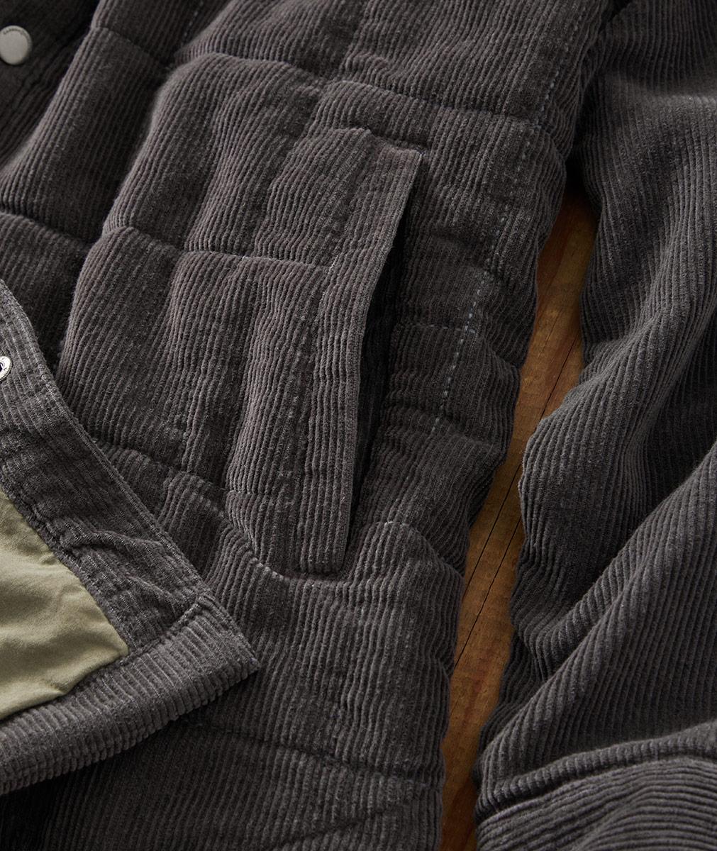 Cord meets quilted jacket. Featuring a soft, fine-wale cord shell, it's quilted with polyester fiberfill, making it hearty, rugged, and cozy. Snap placket with contrast trim. Snap flap pockets and hand warmer pockets. Subtle shirttail hem.