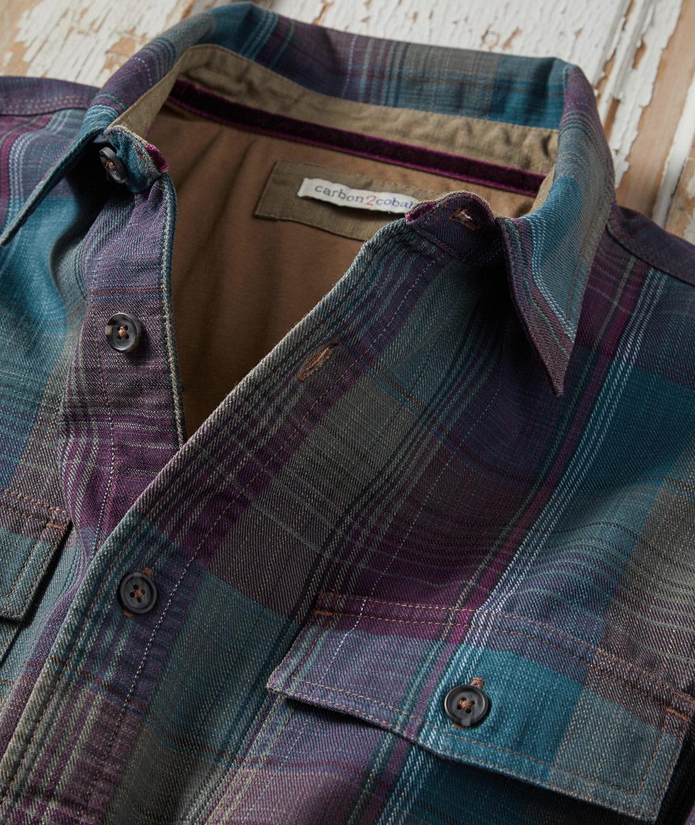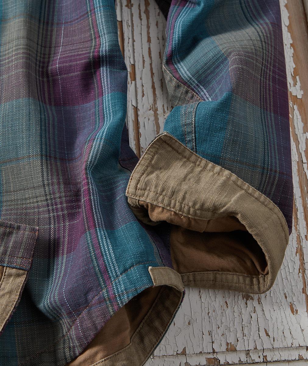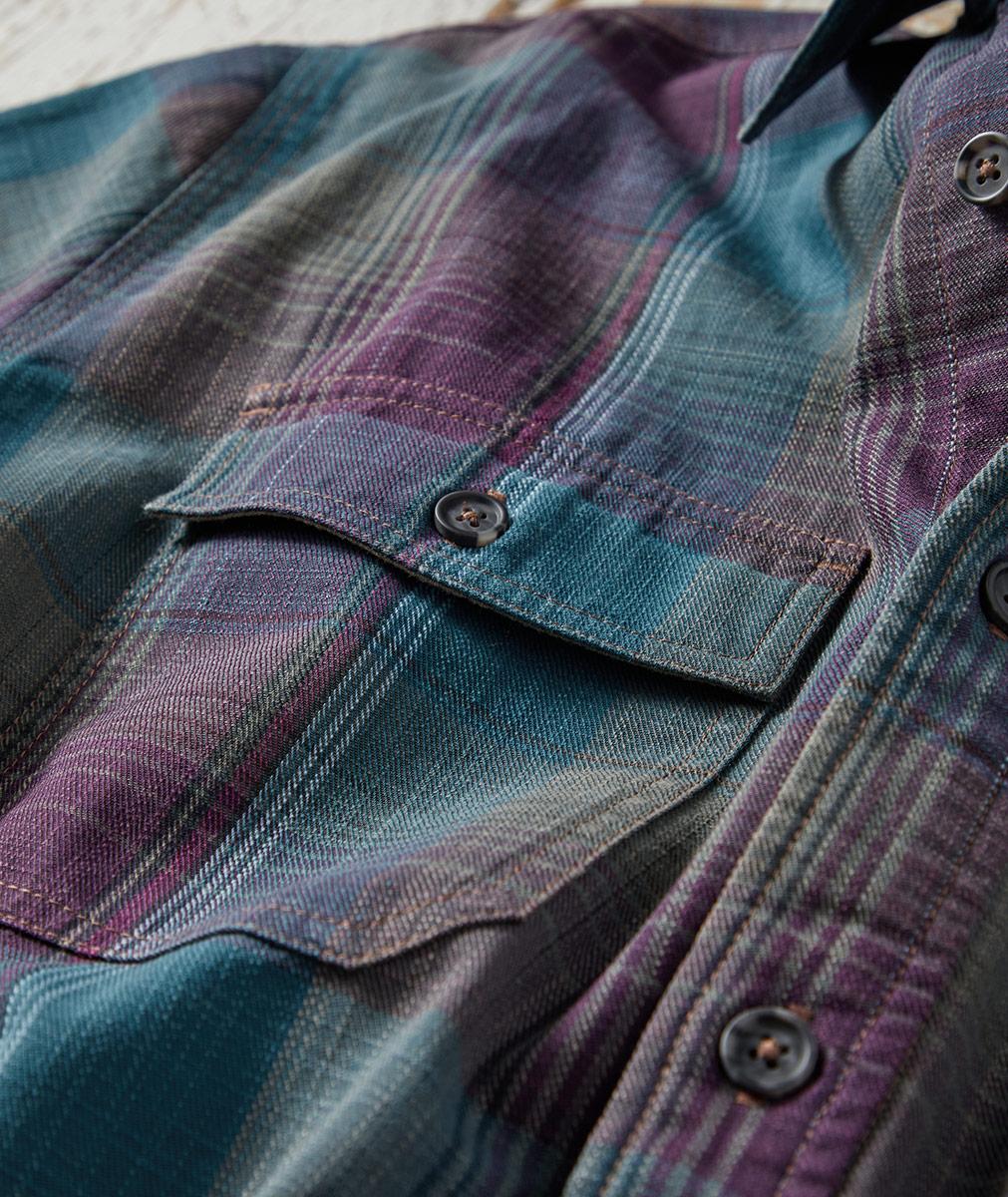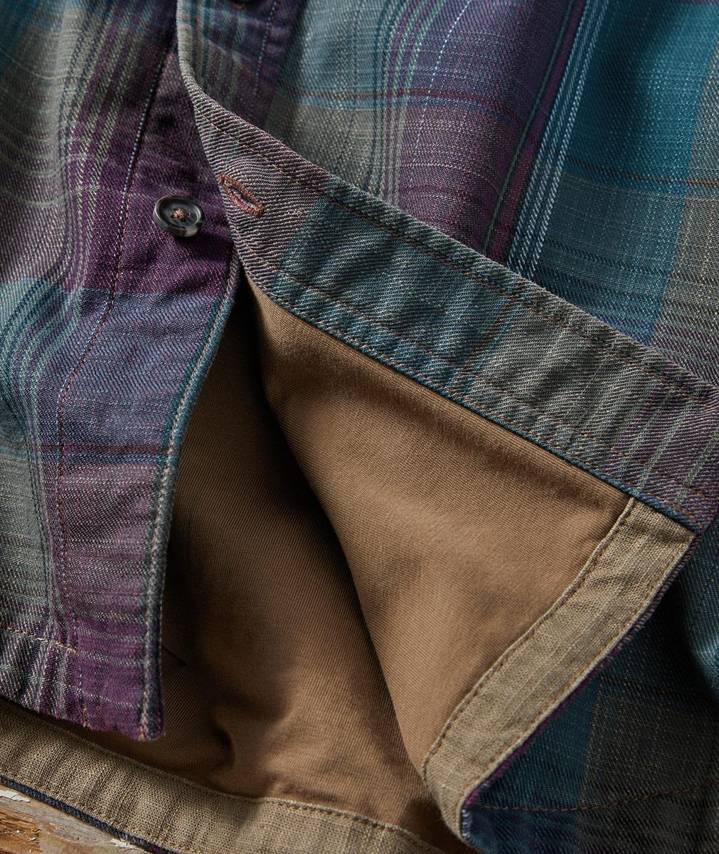 An instant mood booster in plaid form. Featuring pleasing colors and a fabric with textural tooth on the outside, the inside is all softness with a smooth jersey lining. Button-flap chest pockets. Contrast side seam trim.