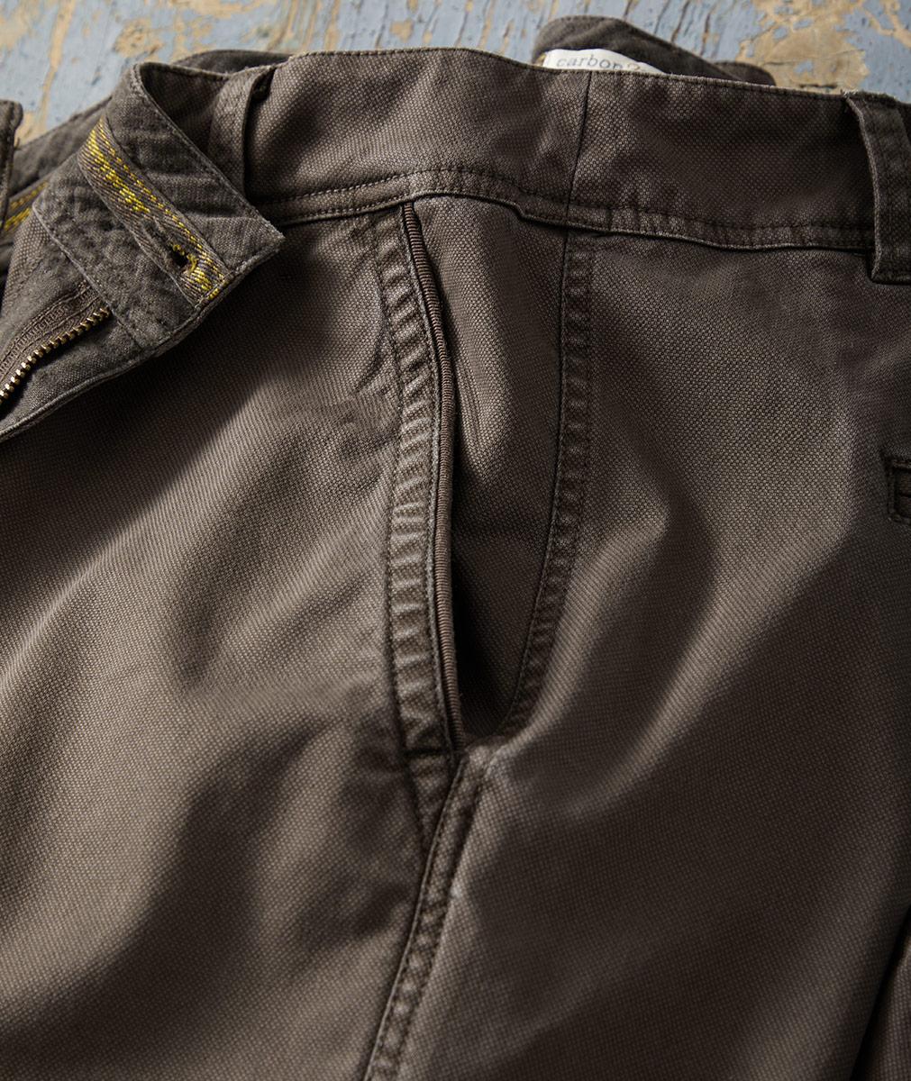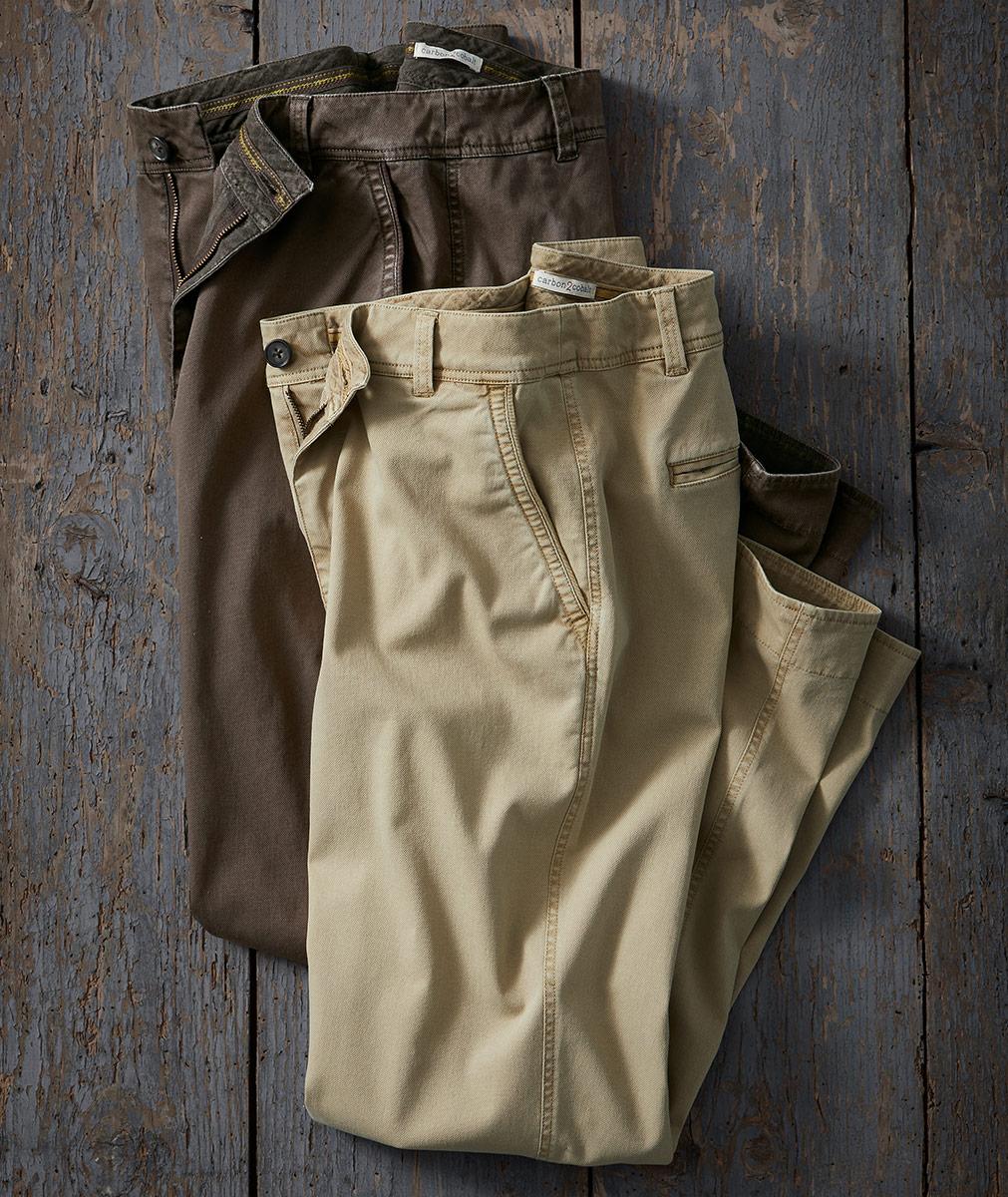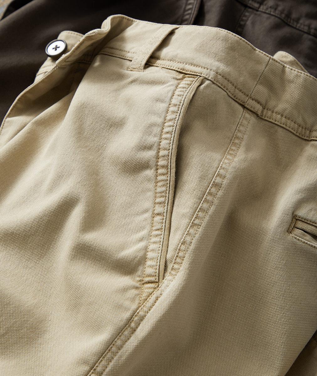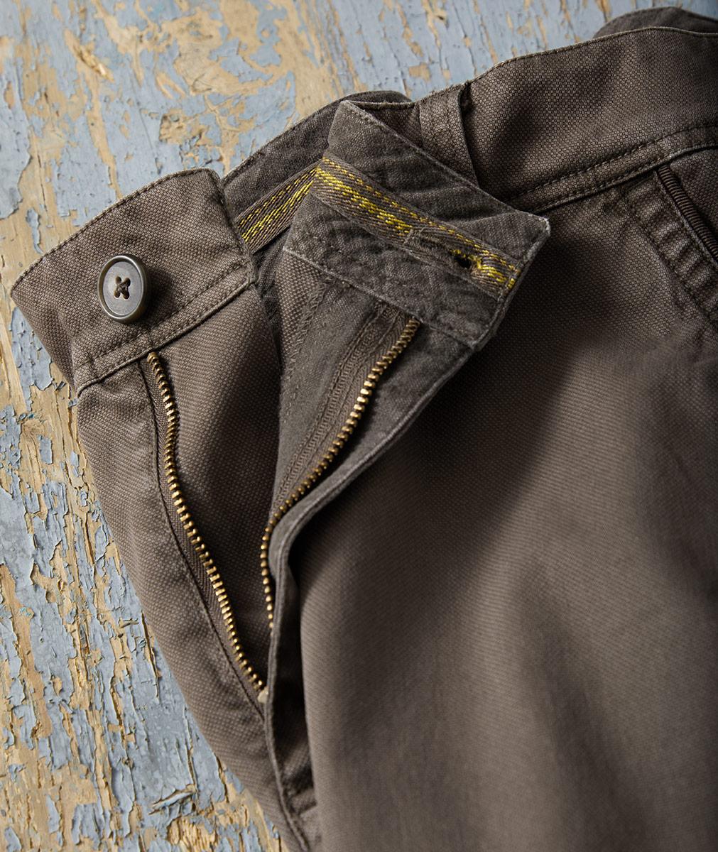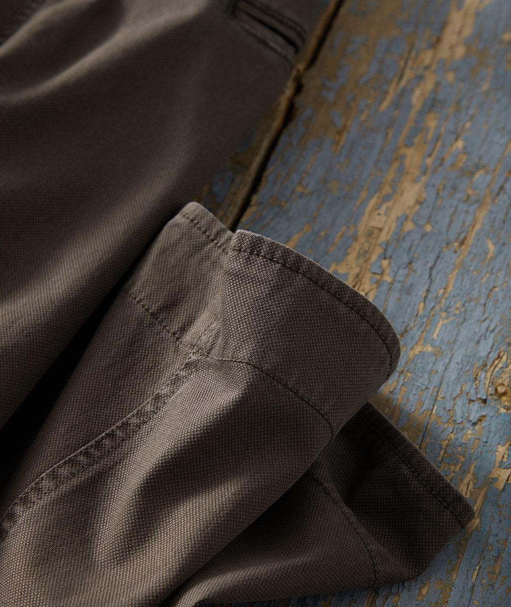 Meet your new workhorses for the week. Lightweight cotton canvas has a crisp, rugged feel balanced with comfy stretch. Classic trouser styling with stitch trim at the bottom leg for interest. Binding at front slash pockets. Two drop-in back welt pockets. Zip fly. Easy straight leg.