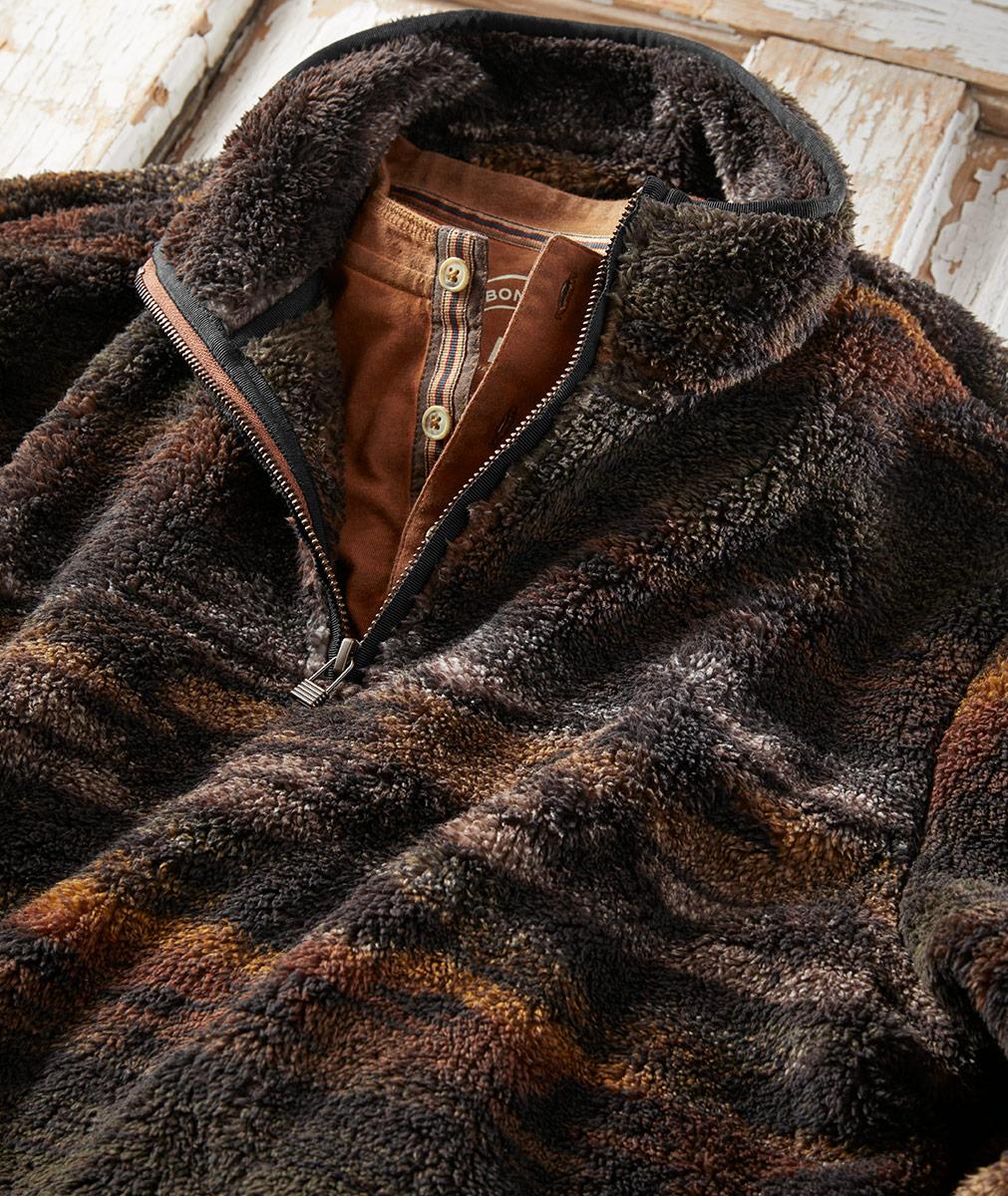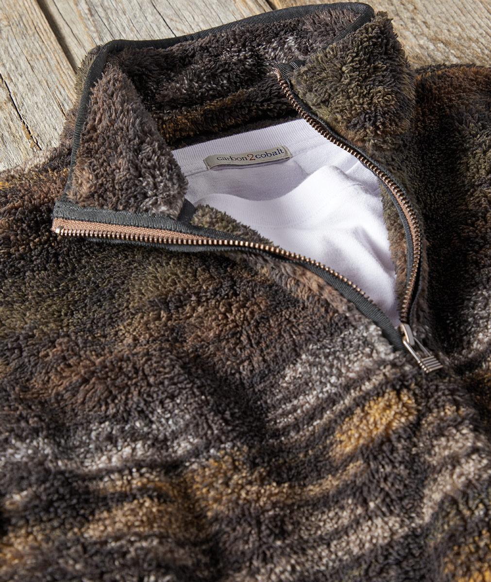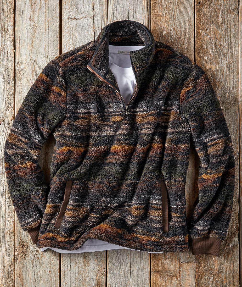 An artistic take on fleece. Featuring a painterly printed motif in rich tones of a desert sunrise, this quarter-zip offers cozy warmth in both look and feel. Jersey-lined kangaroo pocket.