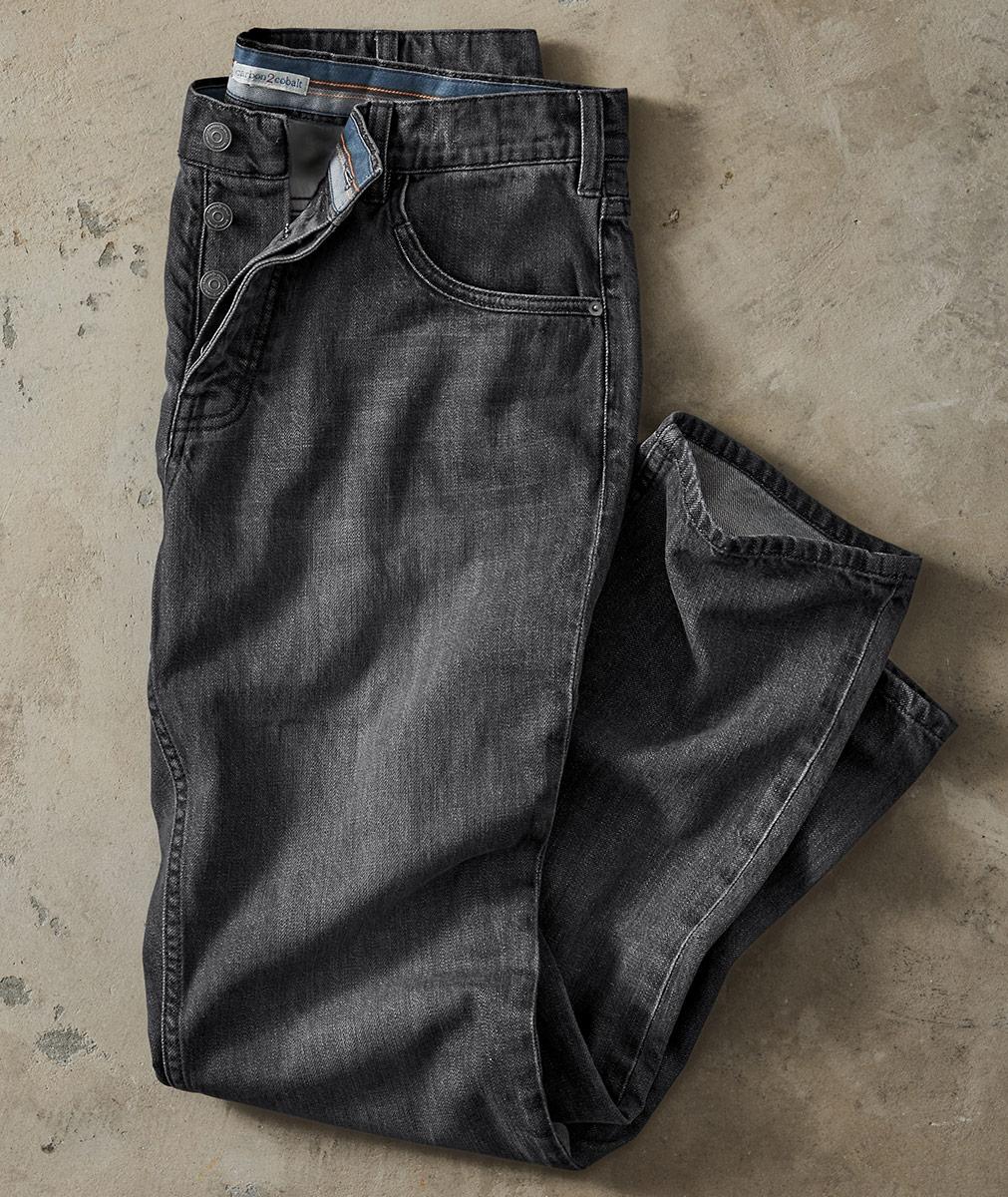 Essential black denim, washed down to vintage perfection. Made from premium ringspun cotton, known for its softness and strength, these jeans become the foundation of your elevated outfit. Five-pocket styling with welt coin pocket. Medium rise. Easy straight leg.