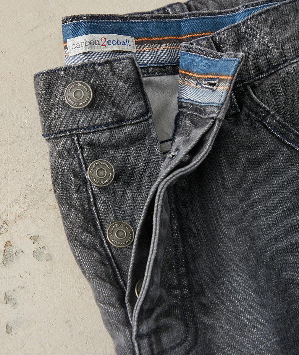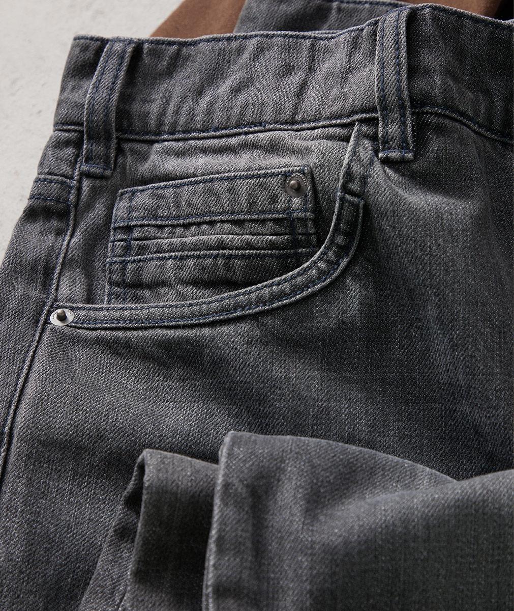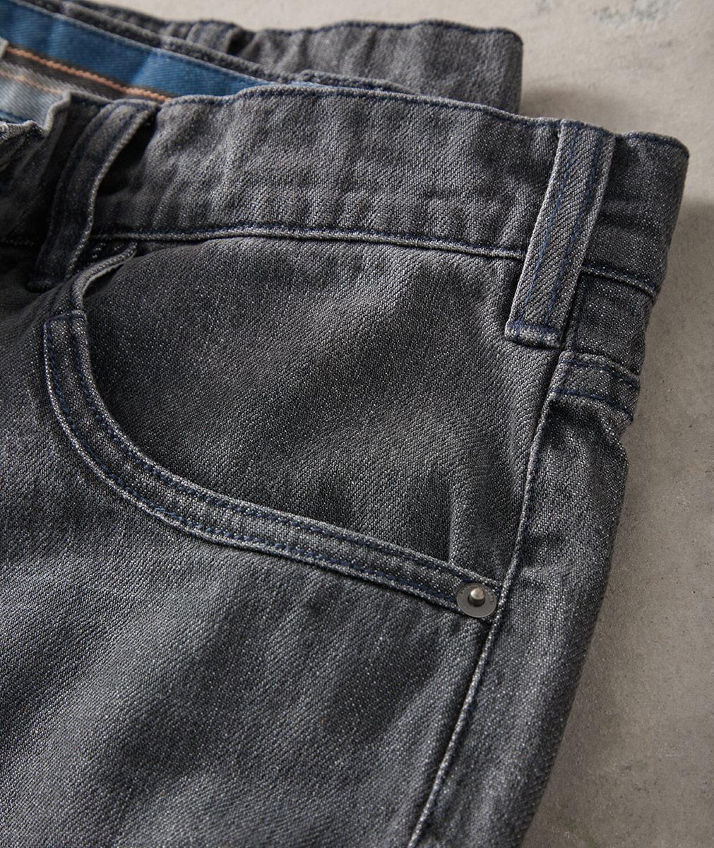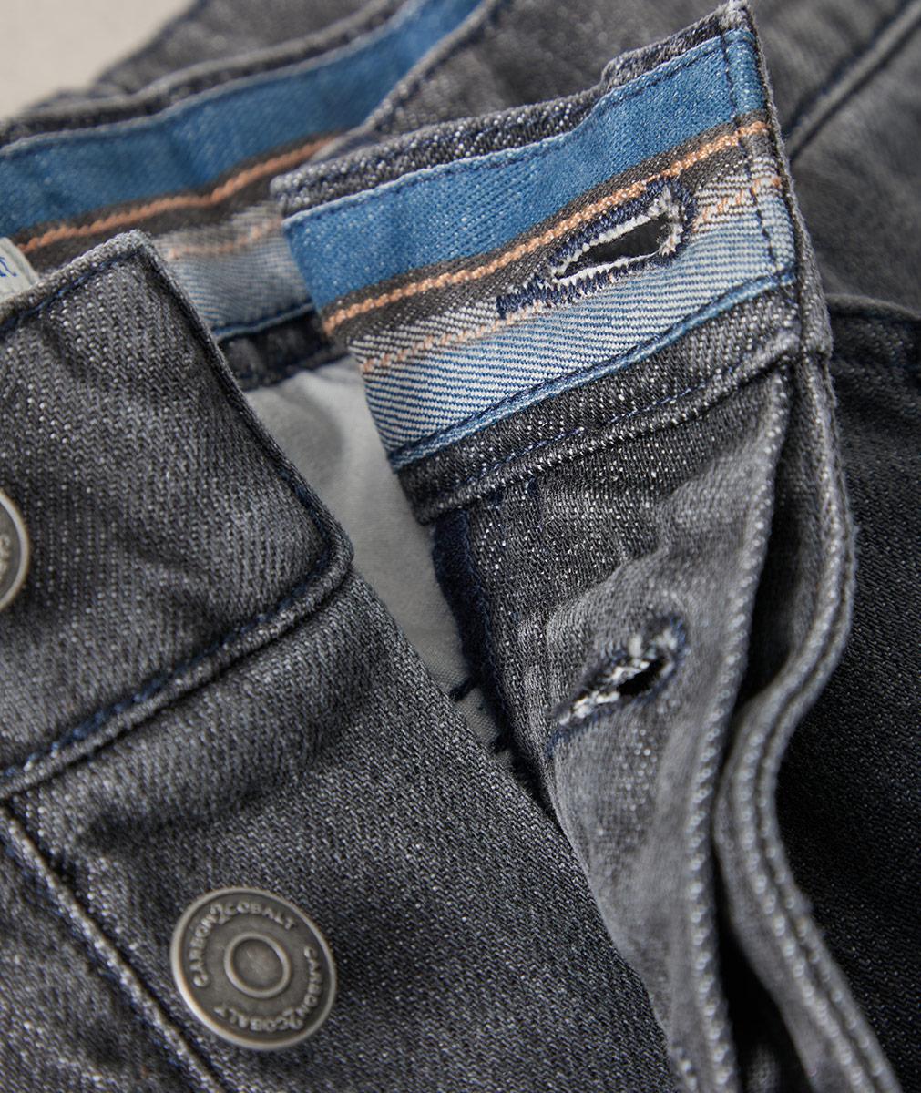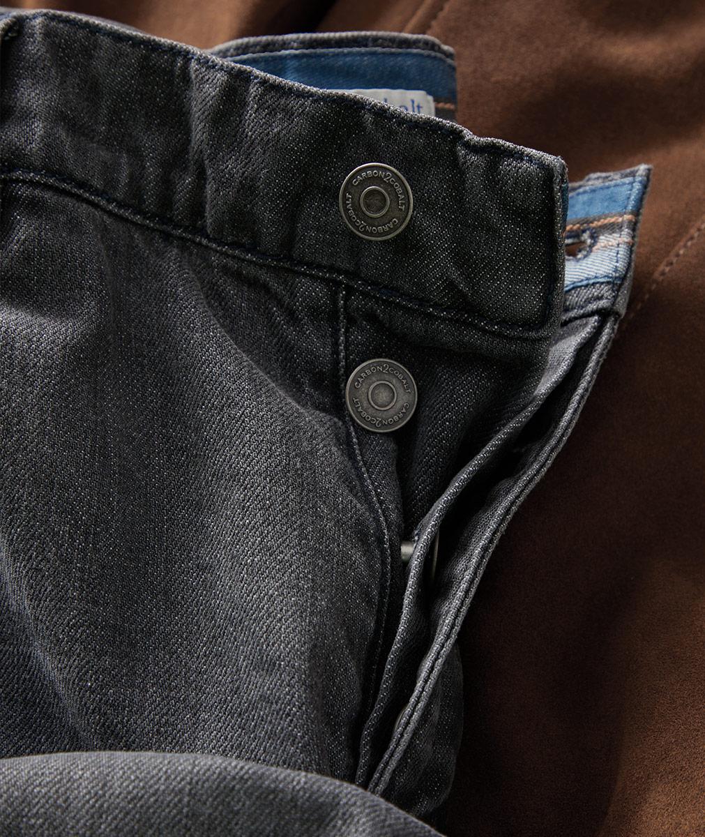 - Five-pocket styling with welt coin pocket