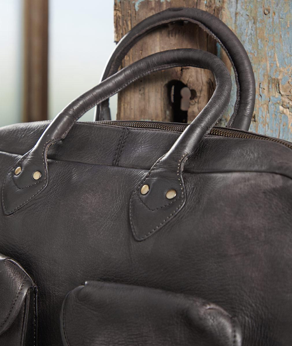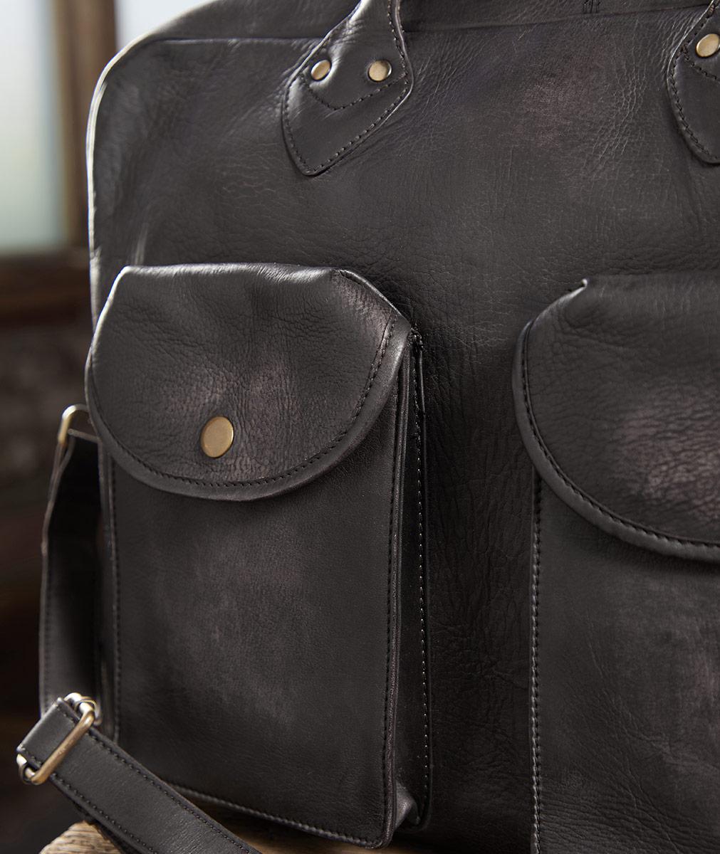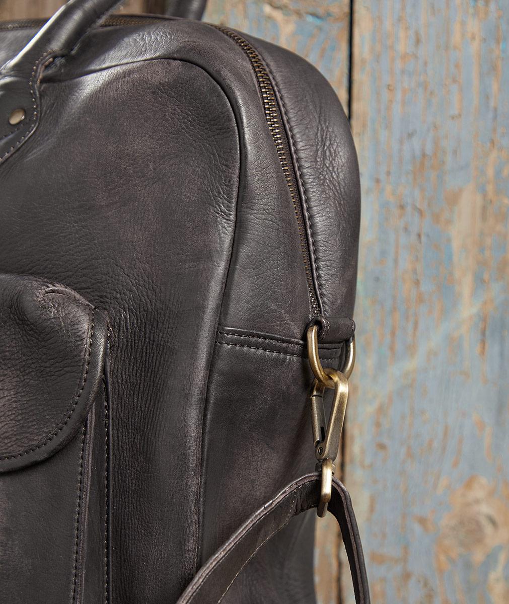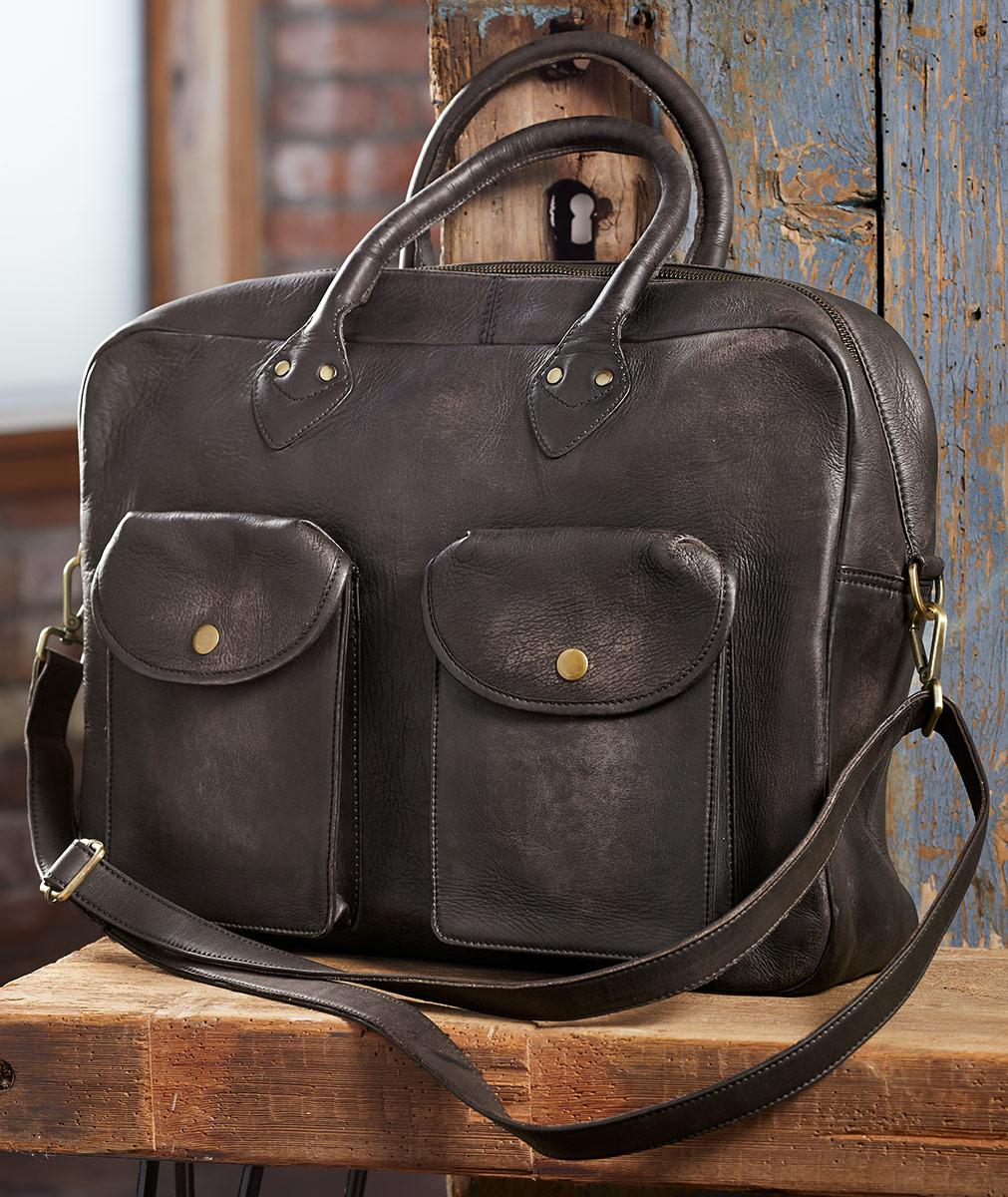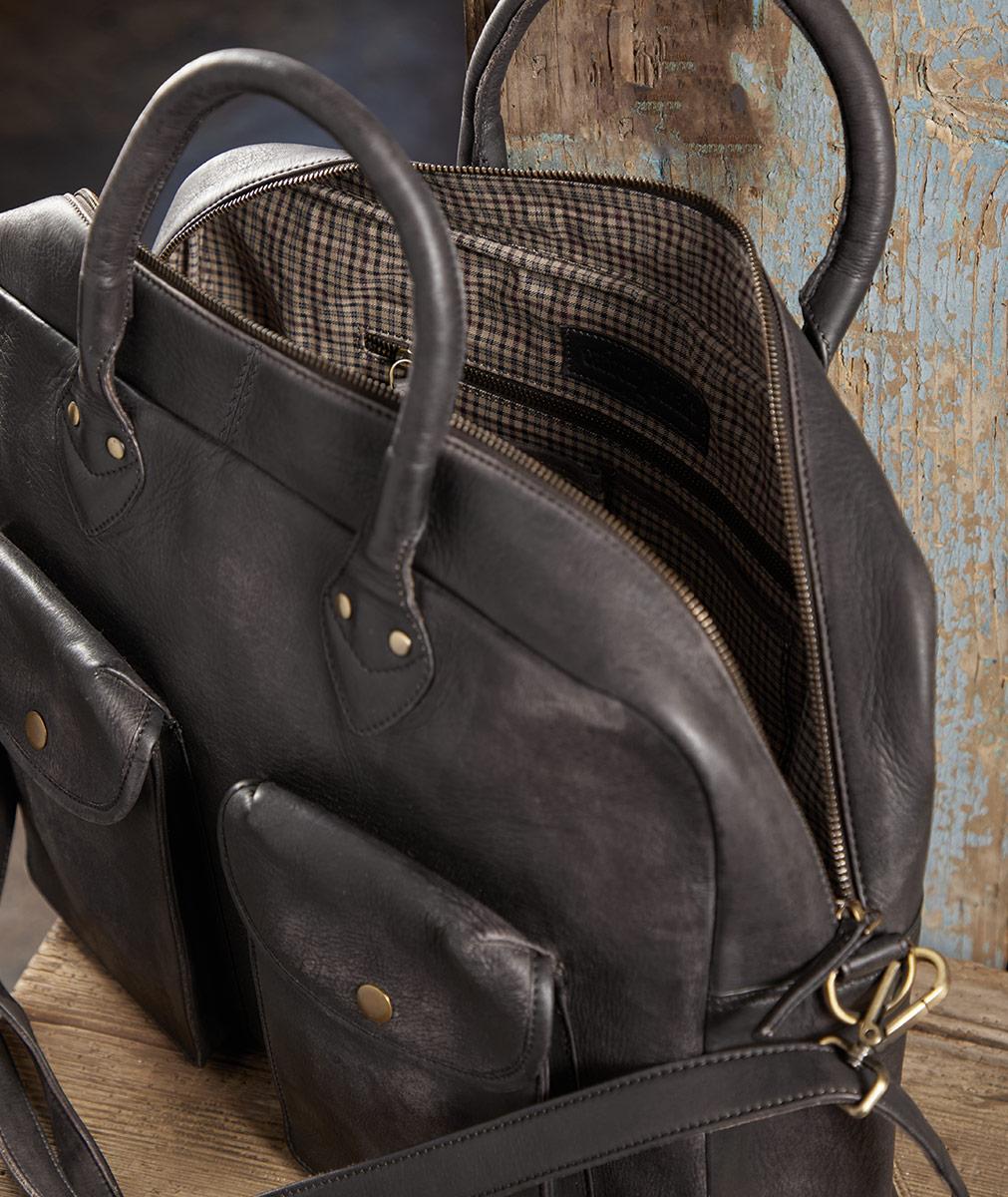 Generously sized for whatever adventure awaits, this all-purpose bag is made of supple, vintage-washed cow leather with brass hardware. Two outside magnetic snap flap pockets for phones and other essentials, plus an exterior slip pocket with magnetic closure. Inside is a padded laptop compartment, one zipper pocket, and two slip pockets. Rolled leather handles and adjustable shoulder strap.