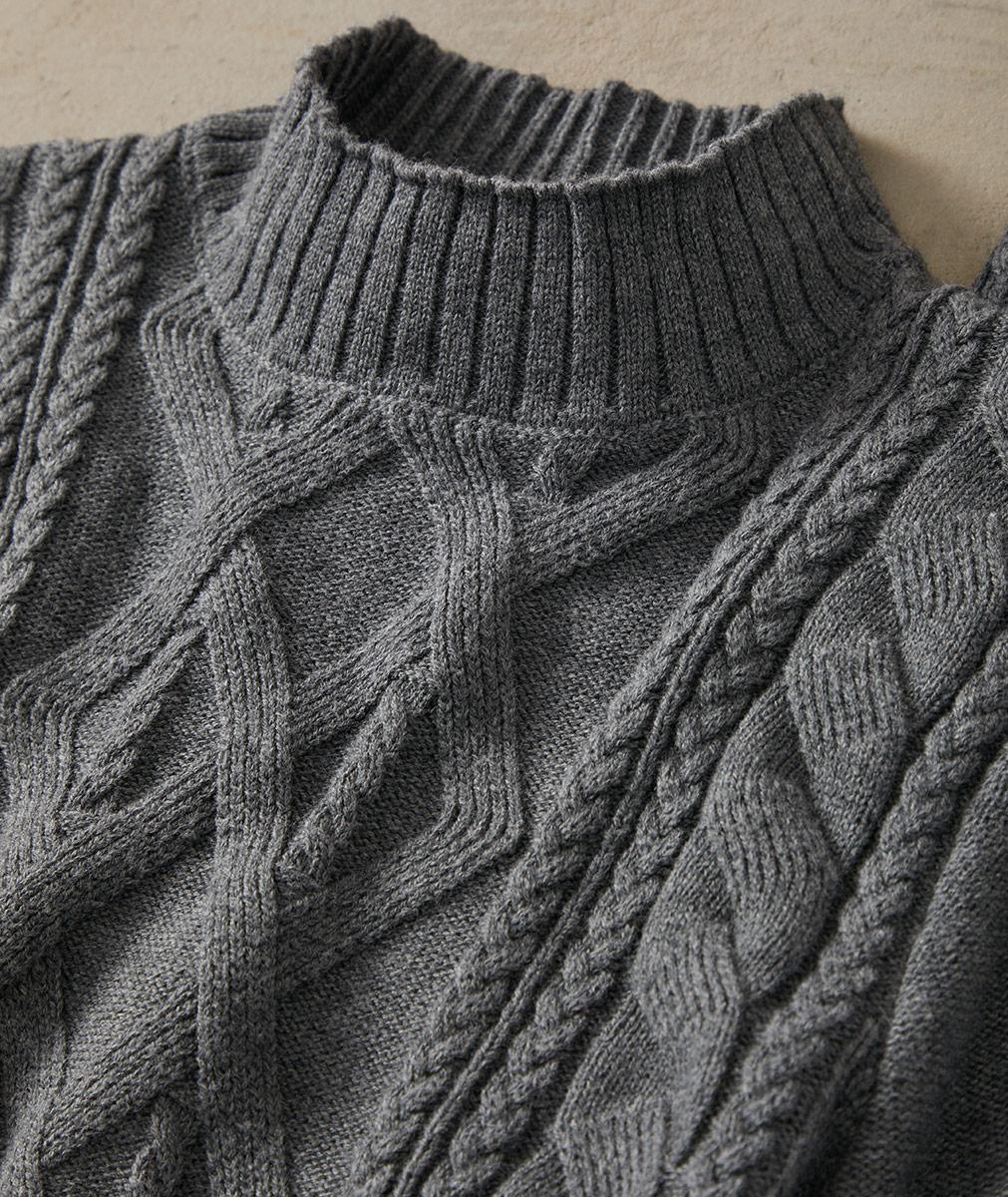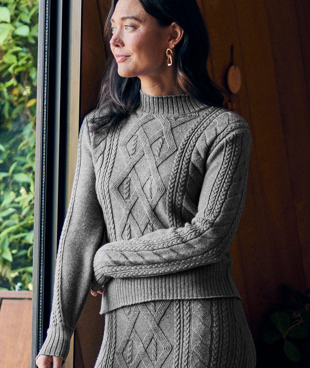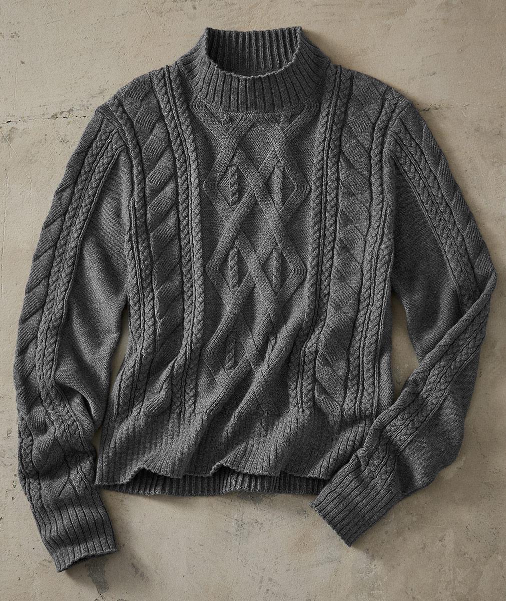 Embracing the heritage cable knit sweater, our version is crafted from a lighter-weight knit blend with a velvety, lofty feel. Featuring traditional motifs both front and back, we styled the under-sleeve with a jersey stitch to sleek the silhouette. Rib-knit mock neck, cuffs, and hem.