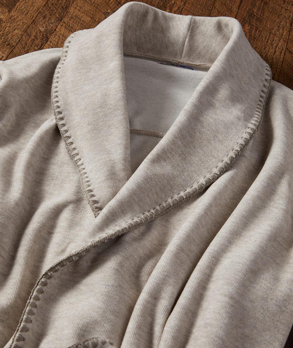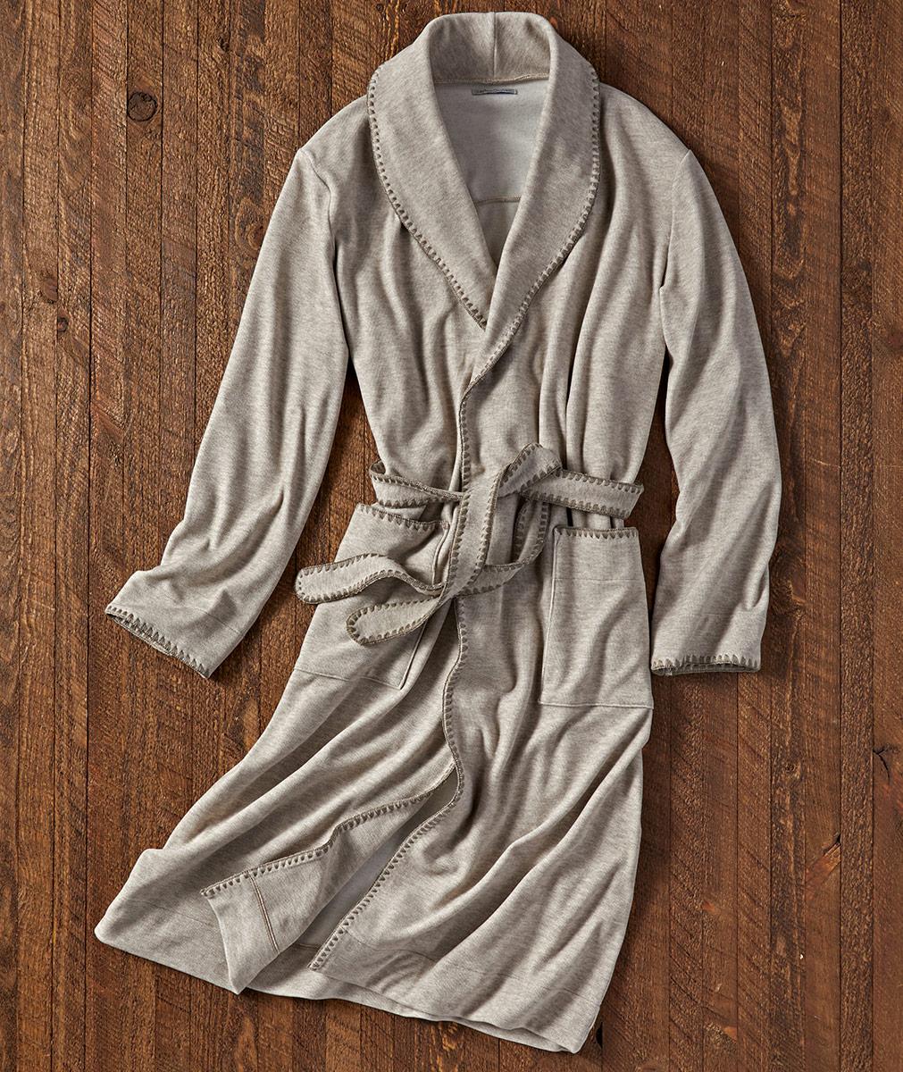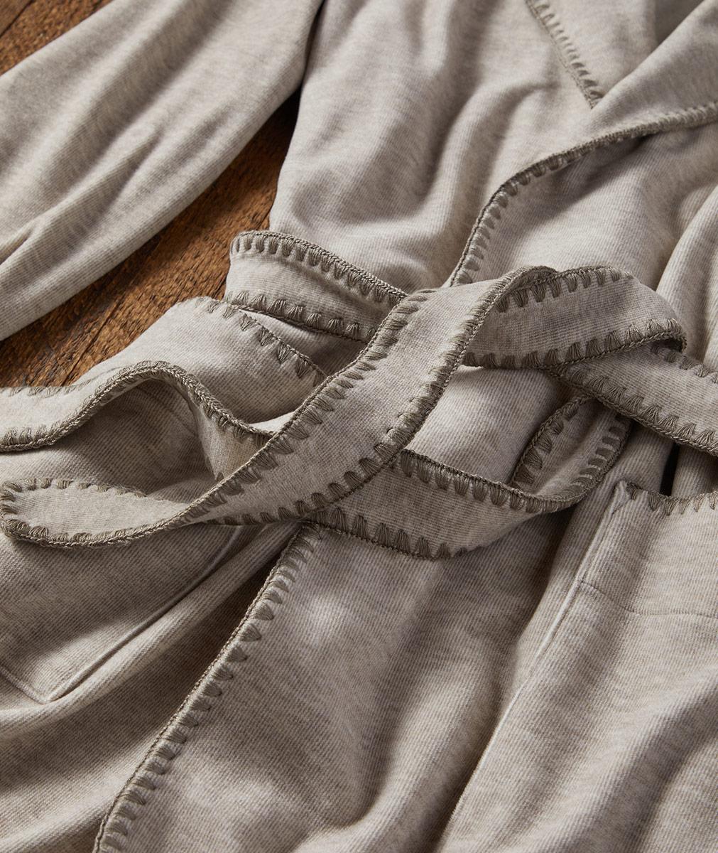 This is one of those robes you have to feel to believe how deliciously soft it is. Made of a sumptuous knit with a velvety feel and a supple drape, it's finished with scallop stitch embroidery. Shawl collar, hip patch pockets, and self belt.
