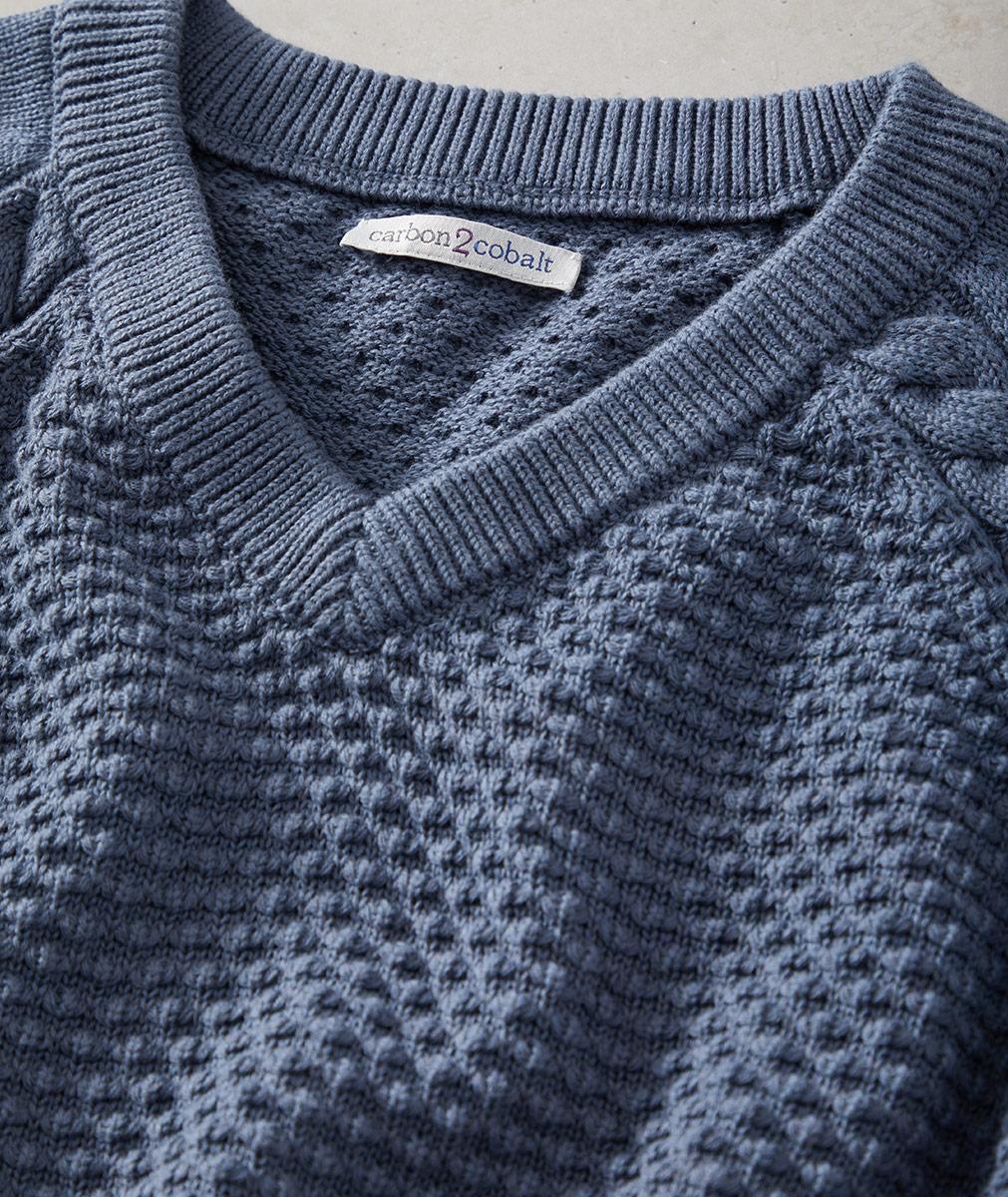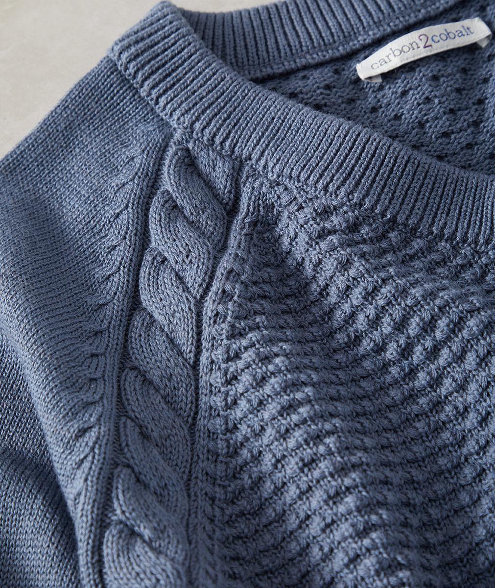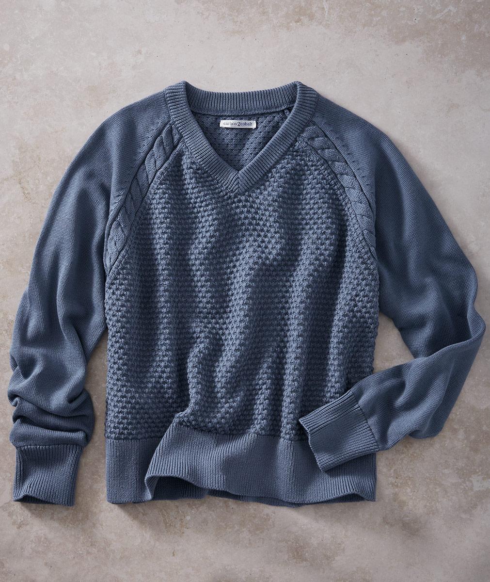 File this under: Instant Classic. Starting with a soft, all-season cotton yarn in a honeycomb stitch, we elevated the style with braided cable detailing at the raglan sleeve. Rib knit v-neck, cuffs, and hem. Jersey knit sleeves keep the silhouette streamlined.