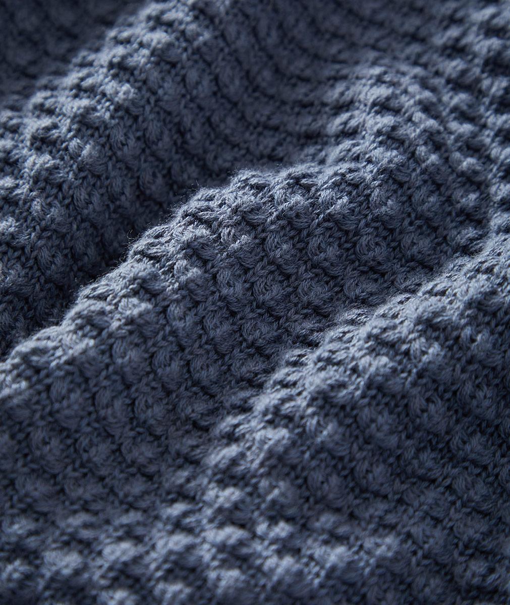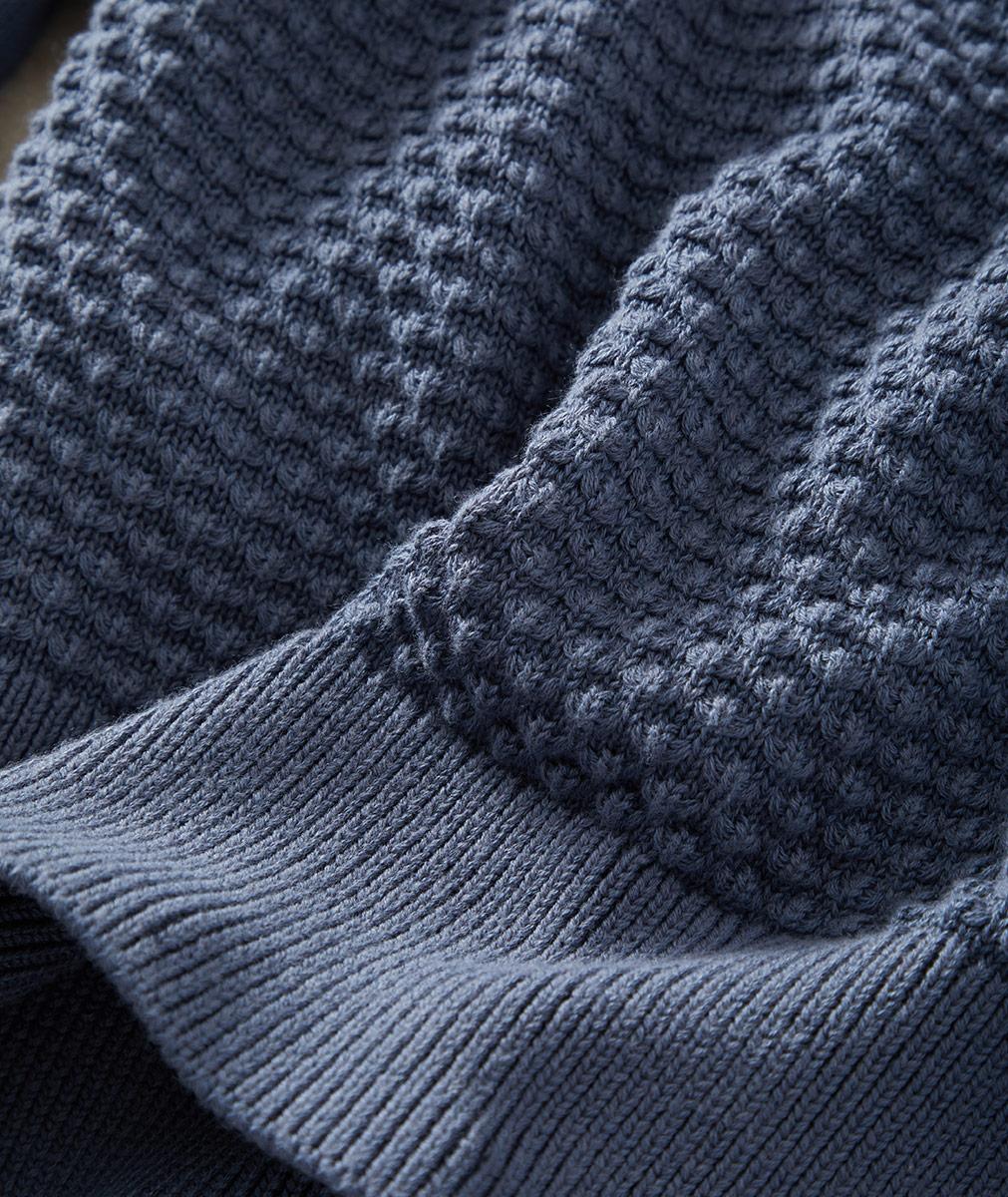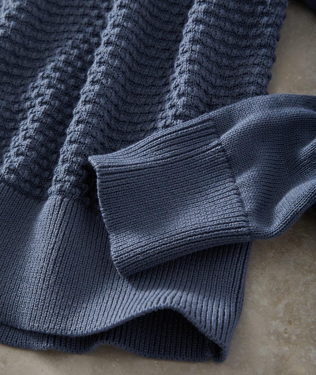 File this under: Instant Classic. Starting with a soft, all-season cotton yarn in a honeycomb stitch, we elevated the style with braided cable detailing at the raglan sleeve. Rib knit v-neck, cuffs, and hem. Jersey knit sleeves keep the silhouette streamlined.