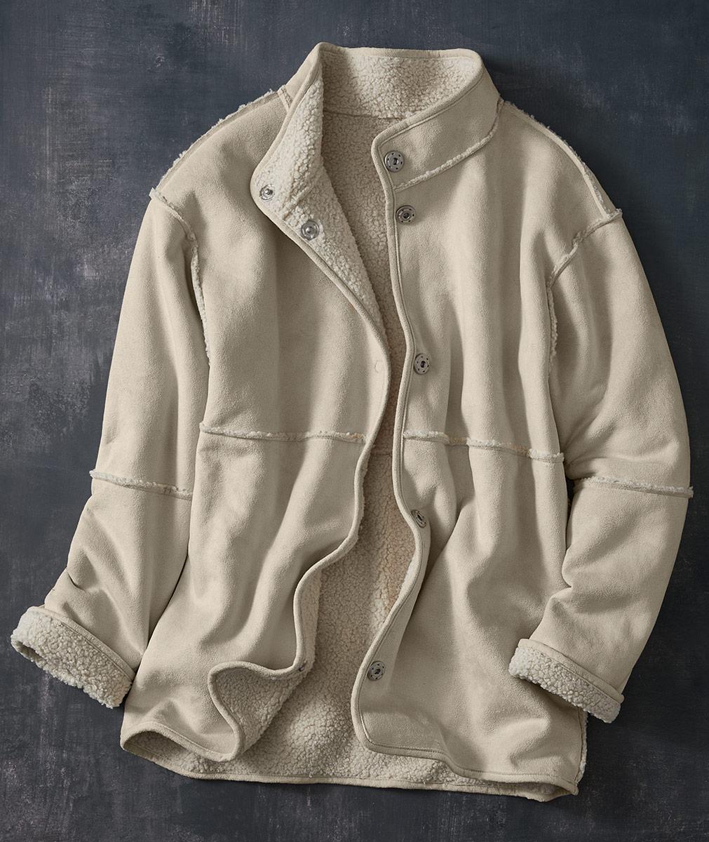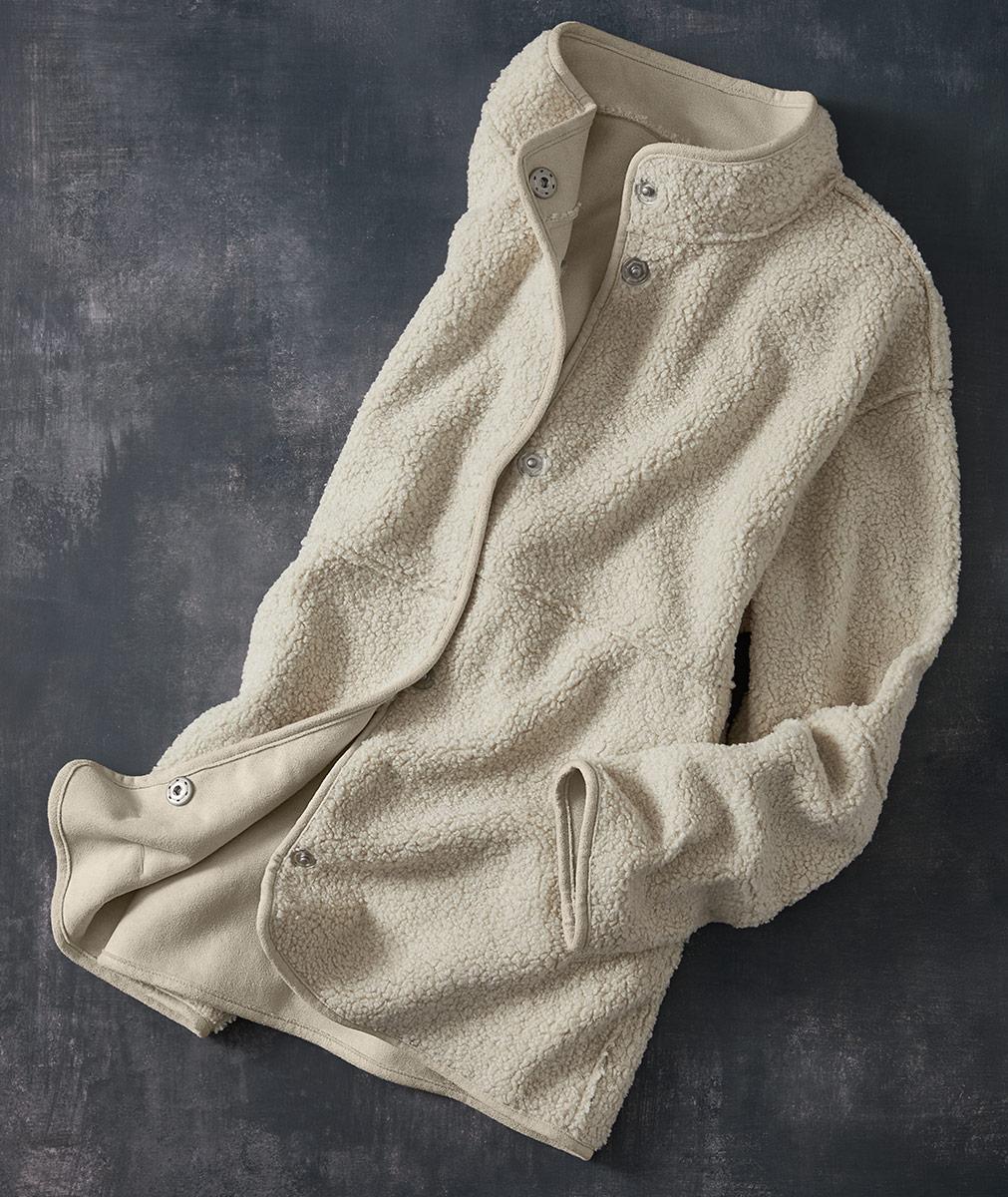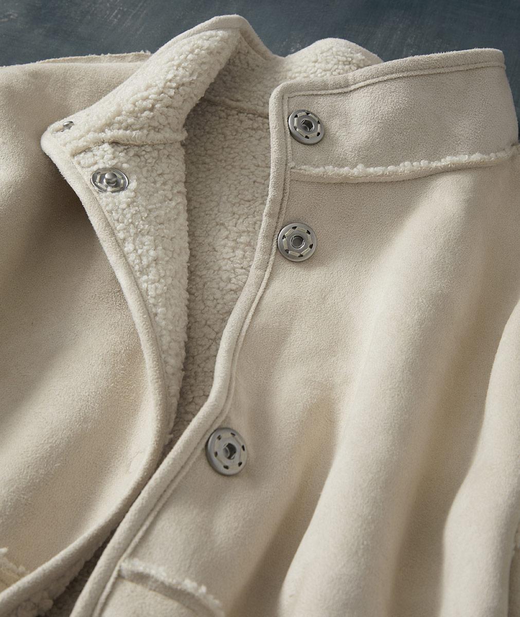 Velvety smooth on one side; soft, low-profile sherpa on the other. This reversible faux sheepskin jacket is cozy, versatile, and ready for any outing. Minimalist detailing includes a snap front placket and side entry pockets.