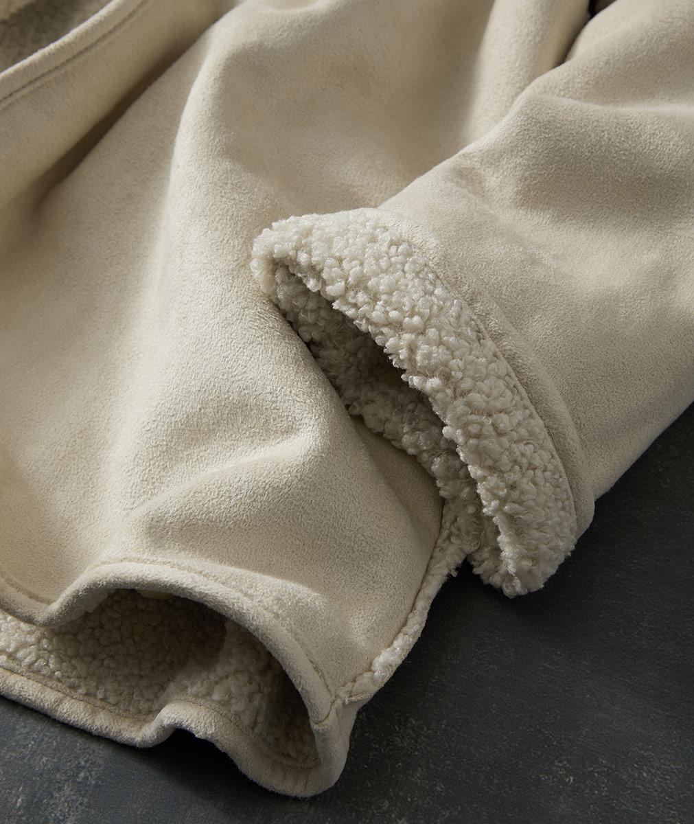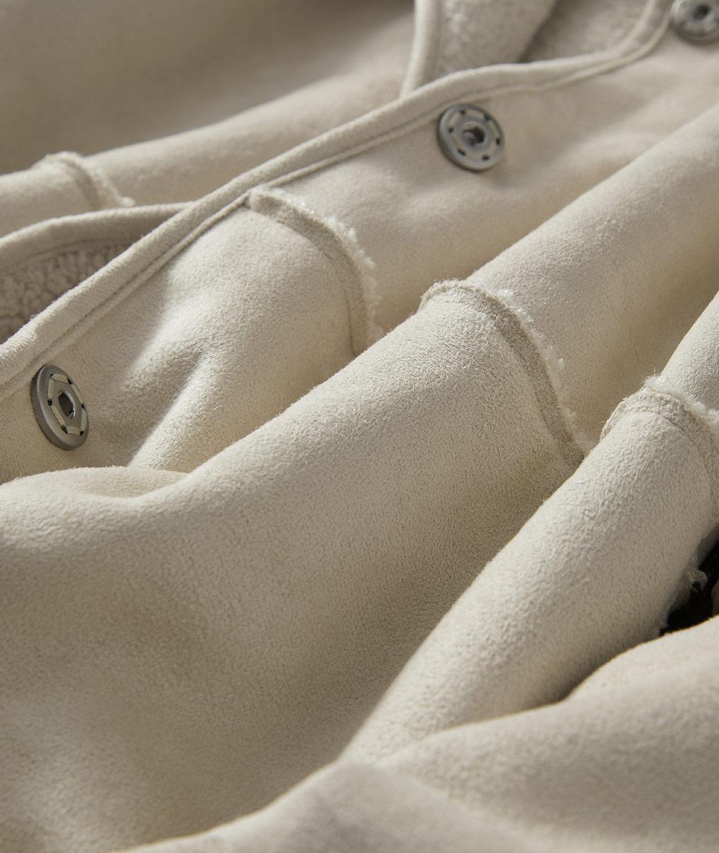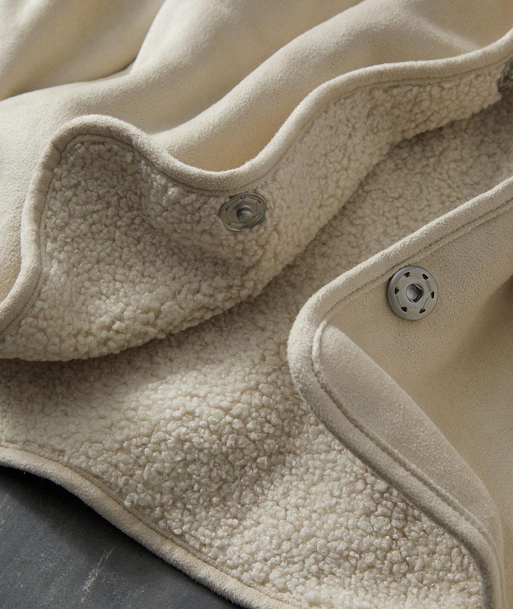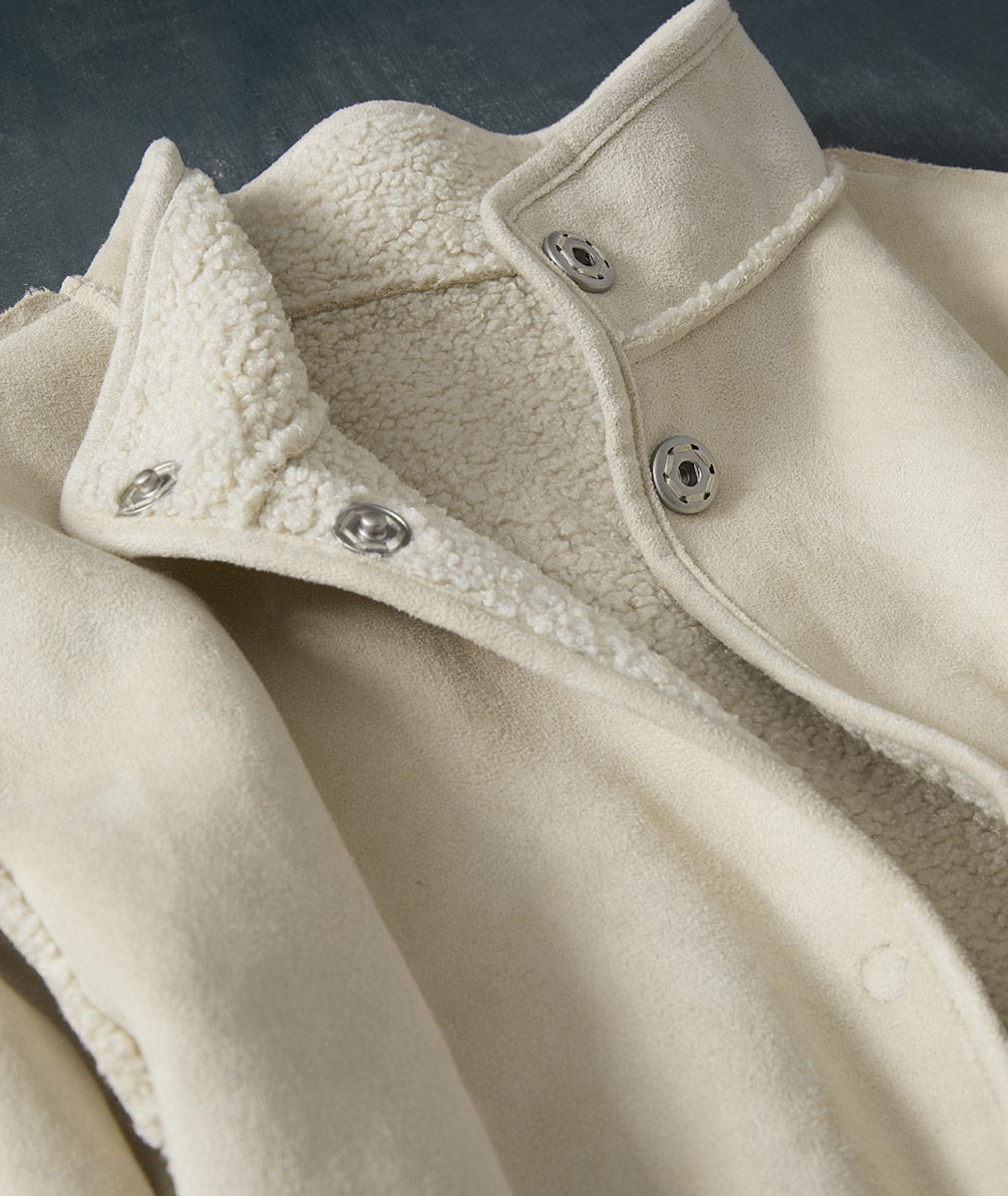 Velvety smooth on one side; soft, low-profile sherpa on the other. This reversible faux sheepskin jacket is cozy, versatile, and ready for any outing. Minimalist detailing includes a snap front placket and side entry pockets.