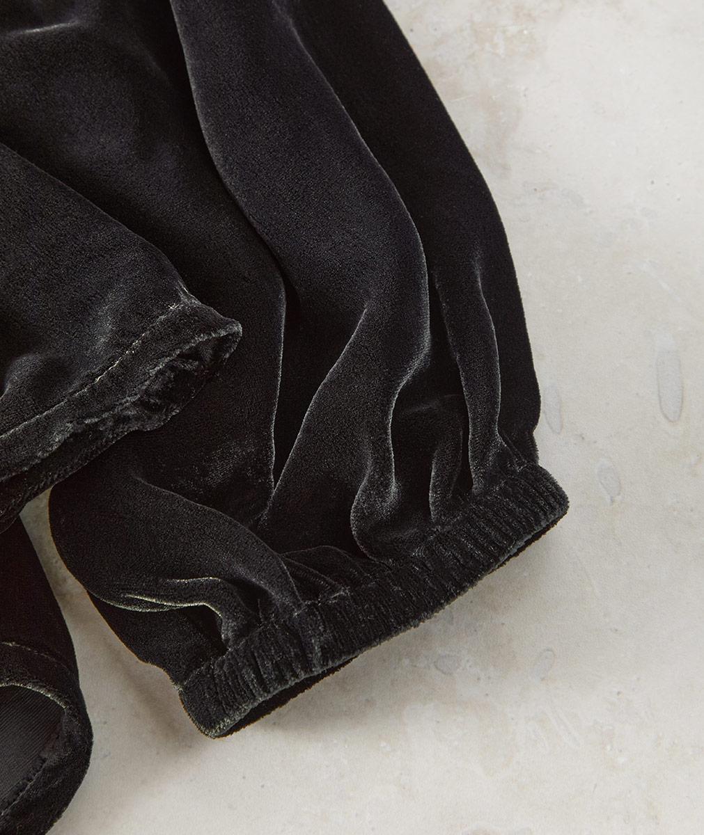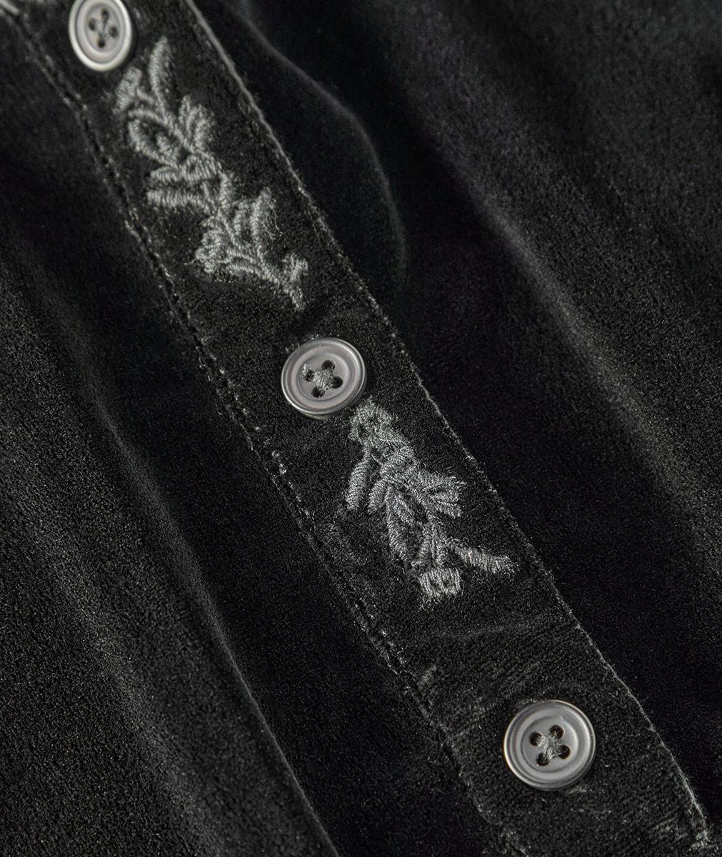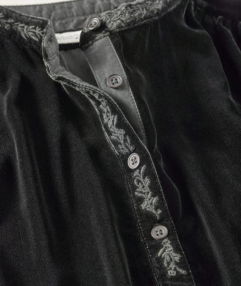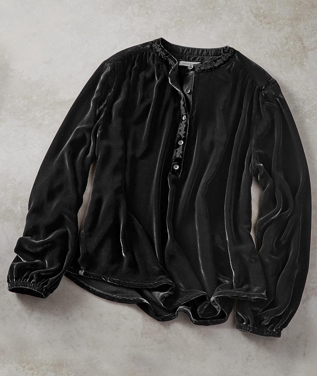 The elegant velvet blouse that can be dressed-up festive or casual with jeans. Soft and supple with an excellent drape, it has a five-button henley-style placket detailed with delicate embroidery. Elasticized cuffs and slightly curved hem.