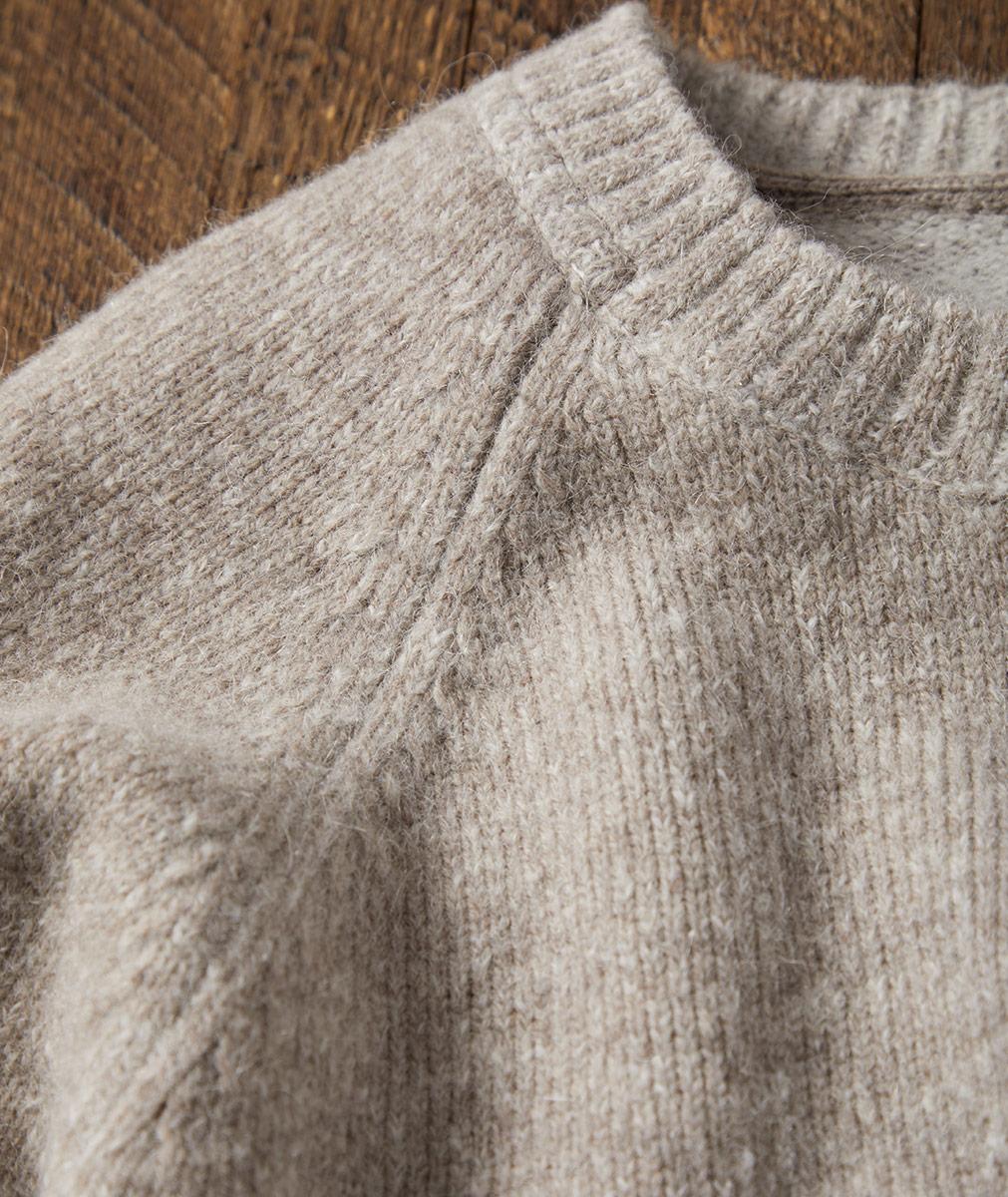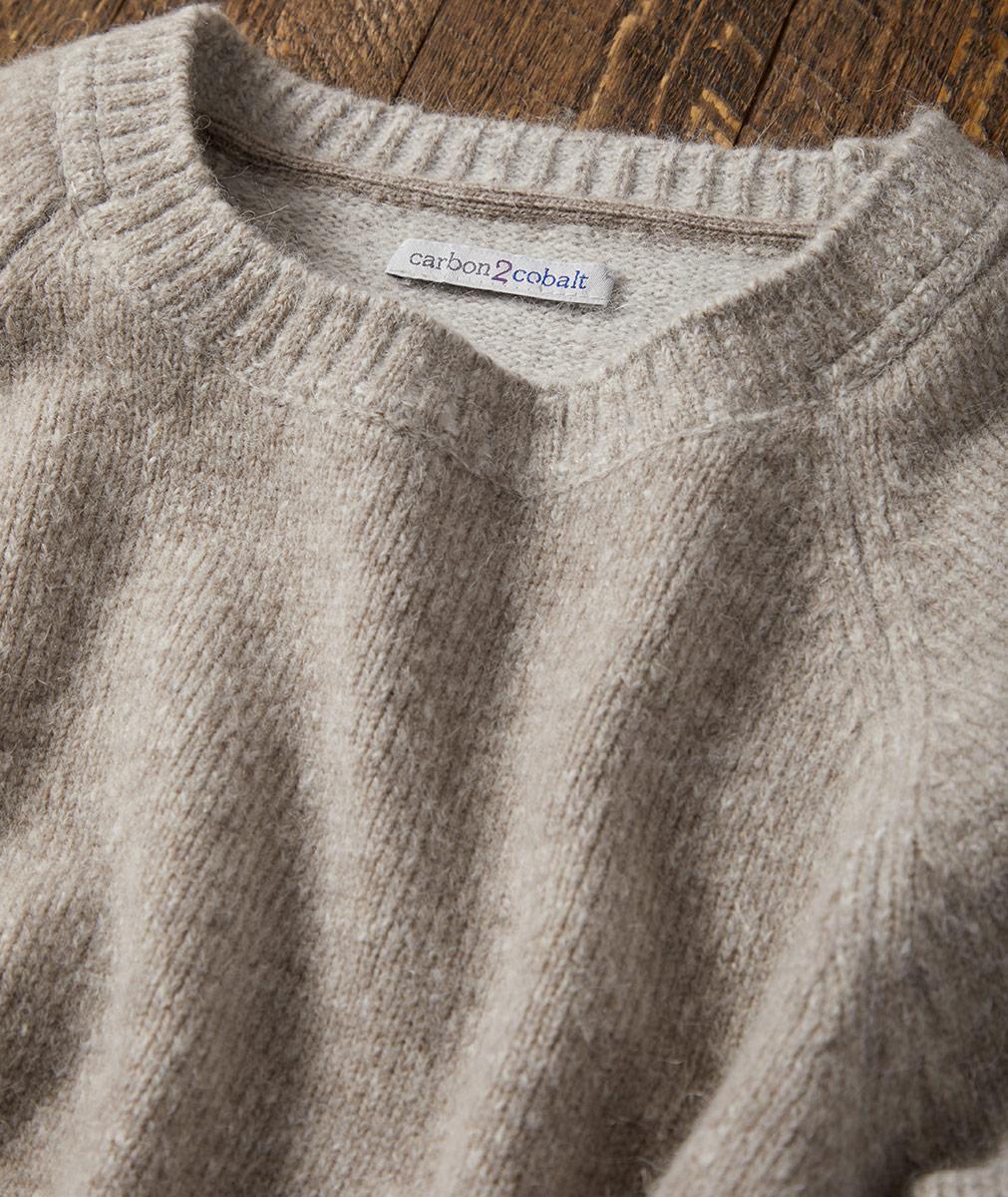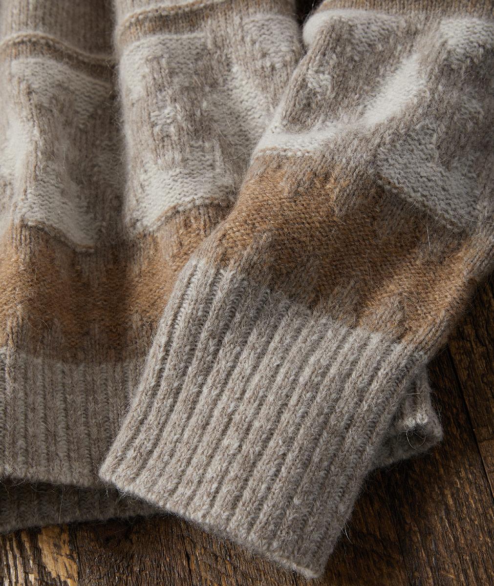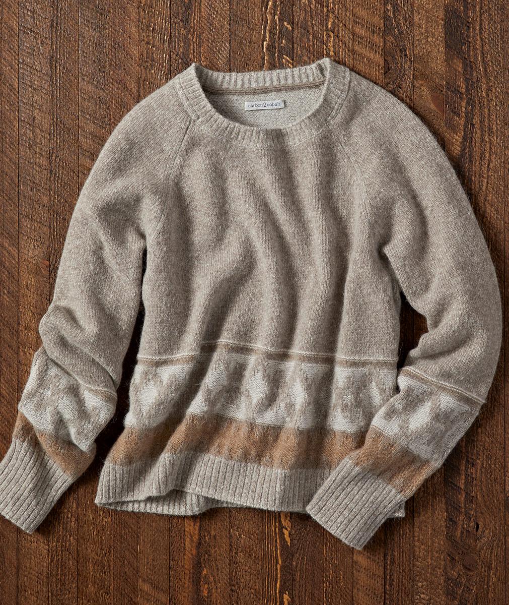 A touch of vintage and a healthy dose of lofty coziness, this sweater captures the mood of the wintry season. Featuring hand-drawn geometric artwork, its neutral palette will go with just about everything. Rib-knit trim at the softly rounded neckline, cuffs, and hem. Fully fashioned raglan sleeves.