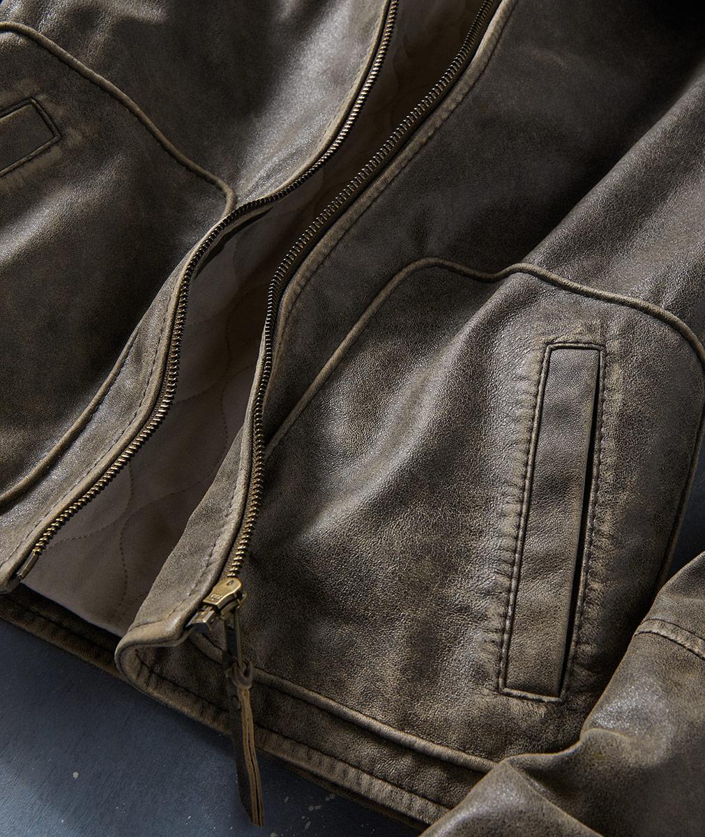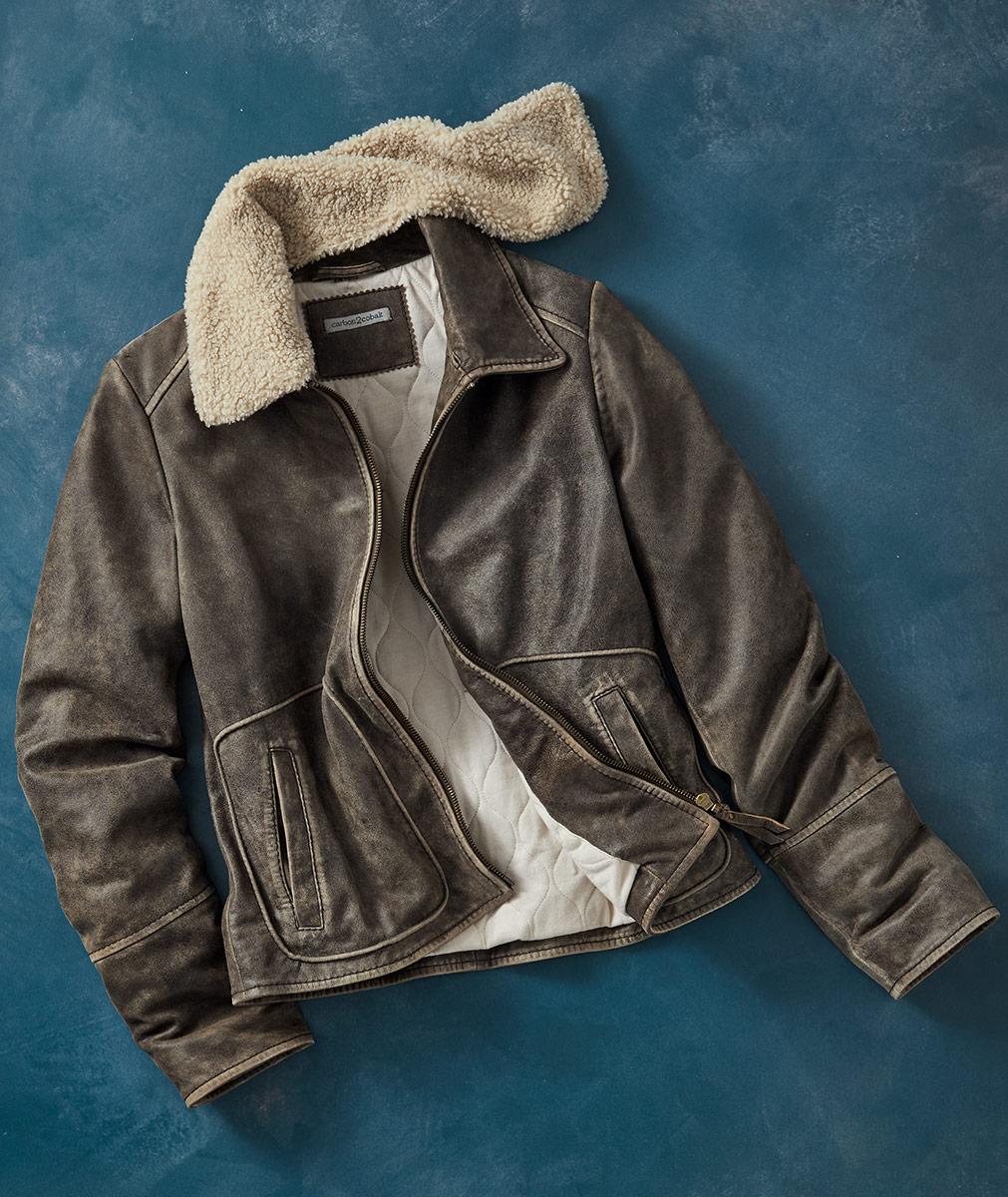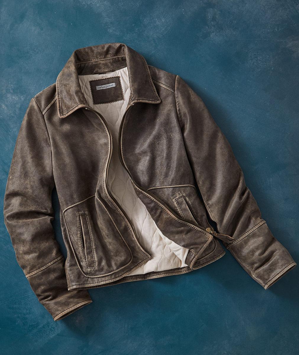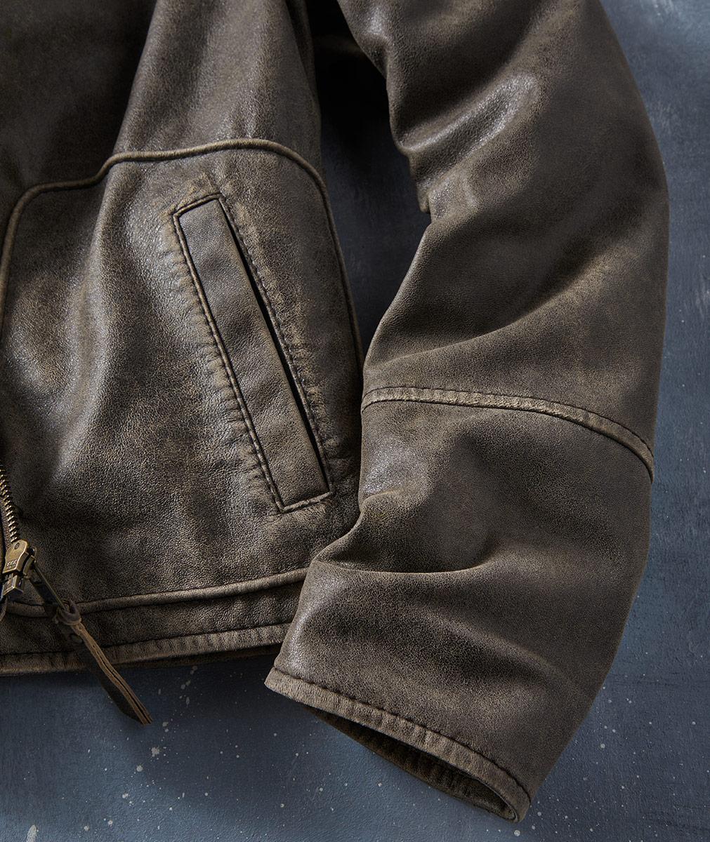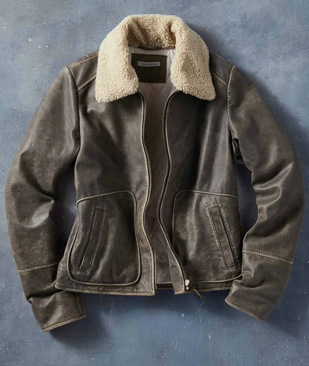 Offering cool vintage style with an air of adventure, our leather bomber offers luxe warmth and beautiful detailing. Specially finished for a well-traveled look and soft feel, it has a faux shearling removable collar and a quilted jersey lining. Unique seaming offers a touch of contrast around the handwarmer pockets. Interior snap pocket. Imported in Tobacco.